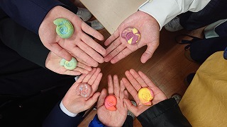 11月17日(金)、高等部1年生約40名で恐竜博物館に行きました。展示された動く恐竜や化石、映像などを興味津々に見学していました。体験学習では、アンモナイト型の消しゴムづくりを行いました。自分だけの消しゴムが完成し、嬉しそうな表情を見せていました。