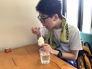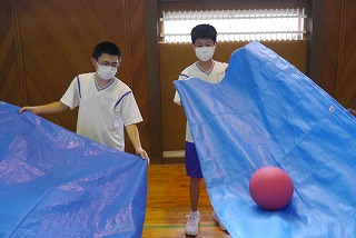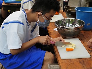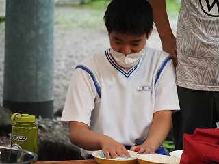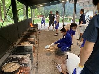初日の研修1は、多目的ホールと体育館でミッションクリアゲームを楽しみました。班ごとにそれぞれの課題に取り組んでいました。その後は、第3炊さん場でカレー作りをしました。熱中症を心配しましたが、心地よい風を感じる中、おいしいカレーを味わうことができました。