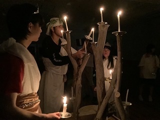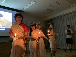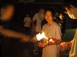 キャンドルサービスでは、担当の生徒がはりきって場を盛り上げてくれました。二日目の研修4のフォトオリエンテーリングでは、班ごとに館内を歩き回り、写真の場面を見つけるという活動でした。班ごとに相談しながら見つける様子が数多くみられ、交流を深める良い活動になりました。