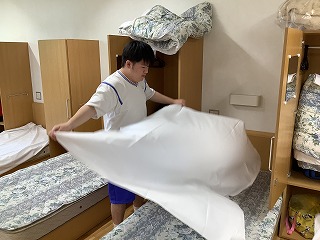 7月10日(木)~7月11日(金)、高等部2年生は芦原青年の家へ宿泊学習に行きました。初日の研修1では、生地からのばす簡単ピザ作りとスープを作りました。自分が作ったピザが焼けると「美味しそう。」と声をあげ、熱々のピザを満足そうに食べていました。研修2では、レクリエーションとキャンドルサービス。生徒たちは、いきいきと活動し、大変盛り上がりました。二日目の研修3では、各クラスに分かれて、活動をしました。(レザークラフト・ディスクゴルフ・おもしろ自転車・足こぎボート・喫茶店利用など)