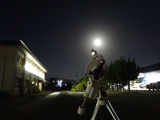 お月見の由来や風習についての話、クイズを行い、その後、外に出て、天体望遠鏡で月を観測しました。日中は雲が多く、月が見られるか心配しましたが、18時過ぎからはすっきり雲が晴れ、きれいな満月が出てきました。「わあ、きれい。」「うさぎが見える。」など大きな歓声があがり、とてもよいお月見となりました。