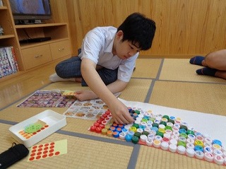 前半は、「夏の思い出を作ろう!」を題材としたちぎり絵を作りました。「さかな」「かに」「せみ」「むしとりあみ」「テント」「キャンプファイヤー」を各班で選び、時間いっぱい作り、各班の味が出る、素敵なちぎり絵が出来上がりました。