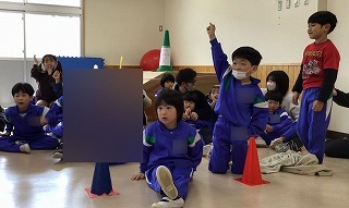風船ゲームをしました。二人組になって風船をうちわで挟んだり、新聞紙にのせたりして、落とさないように協力して運びました。好きな友達と一緒に楽しむことができました。