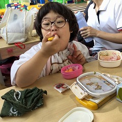 調理でクレープを作りました。材料を混ぜたり、出来上がった生地に自由にトッピングしたりしてオリジナルのクレープが完成しました。みんなおいしく食べて、にこにこでした。