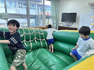 6月26日(木)、27日(金)と2日間にわたって、ミックス遊びをしました。クラスごとにエアトランポリン、カラーボール遊び、光遊び、シャボン玉遊び、紙遊び、風船遊びの6つのコーナーを回りました。好きな遊びを見つけると時間を忘れて夢中で遊び、楽しそうな声とたくさんの笑顔があふれていました。